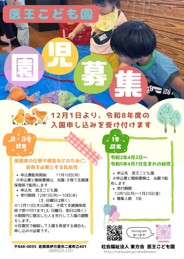 随時、伊万里市役所子育て支援課保育係で受け付けています。1号認定の入園は医王こども園で受け付けます。