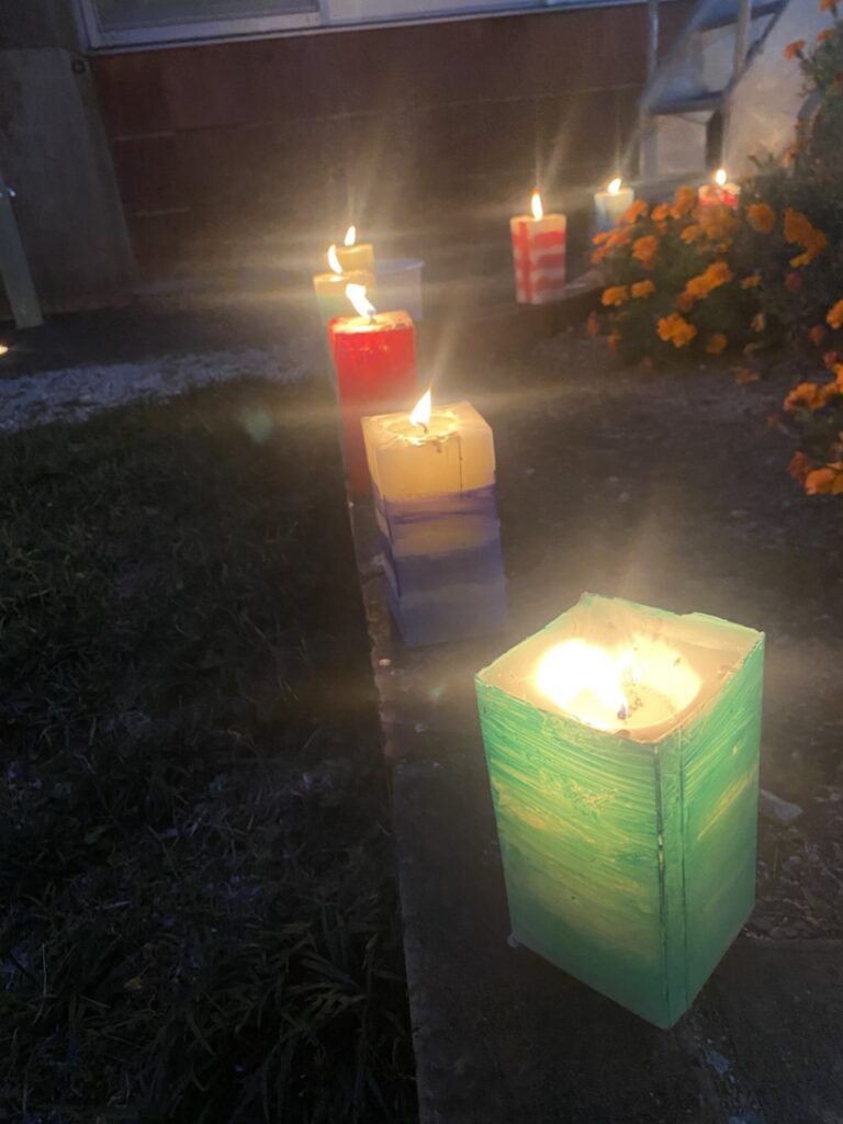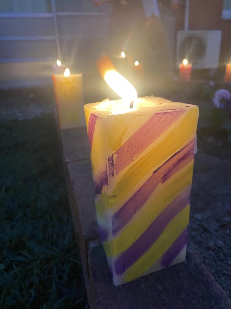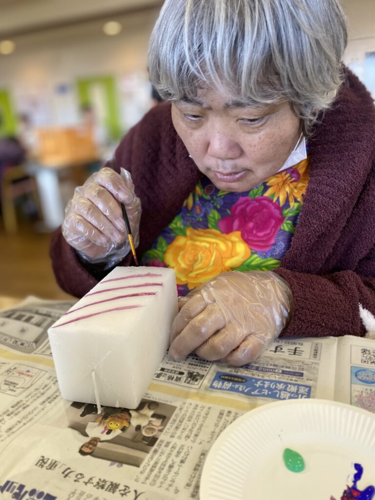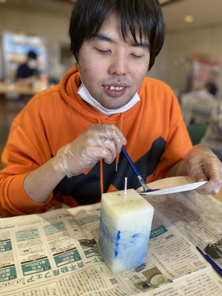 今回は牛乳パックで製作した特大ロウソクをデイ利用者の皆様が思い思いにペイント