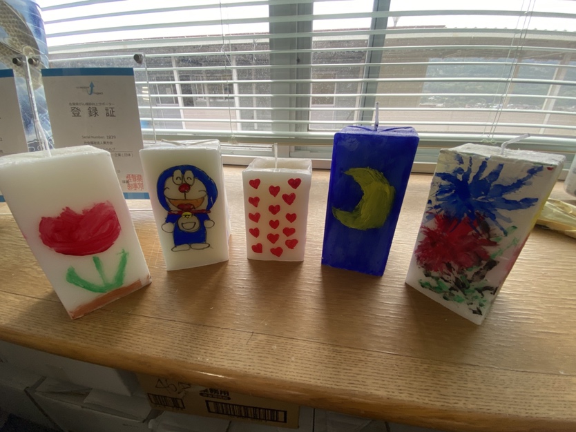 好きなアニメのイラストやメッセージ等、こんなにカラフルで愛らしいロウソクが出来上がりました