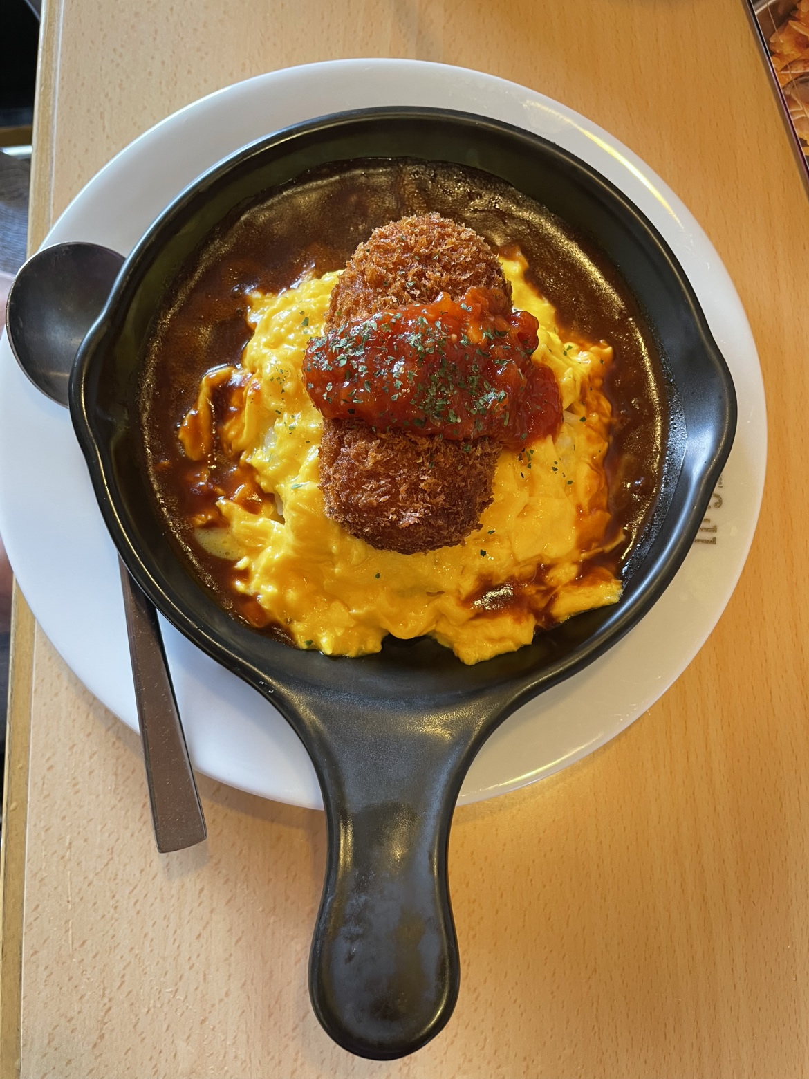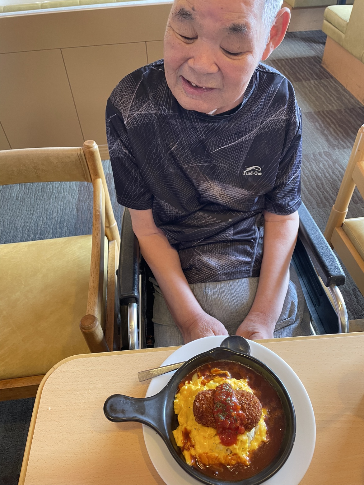ジョイフルでカニクリームのコロッケが乗ったオムライスとコーヒーゼリーを美味しそうに召し上がりました😊 | ![]() |