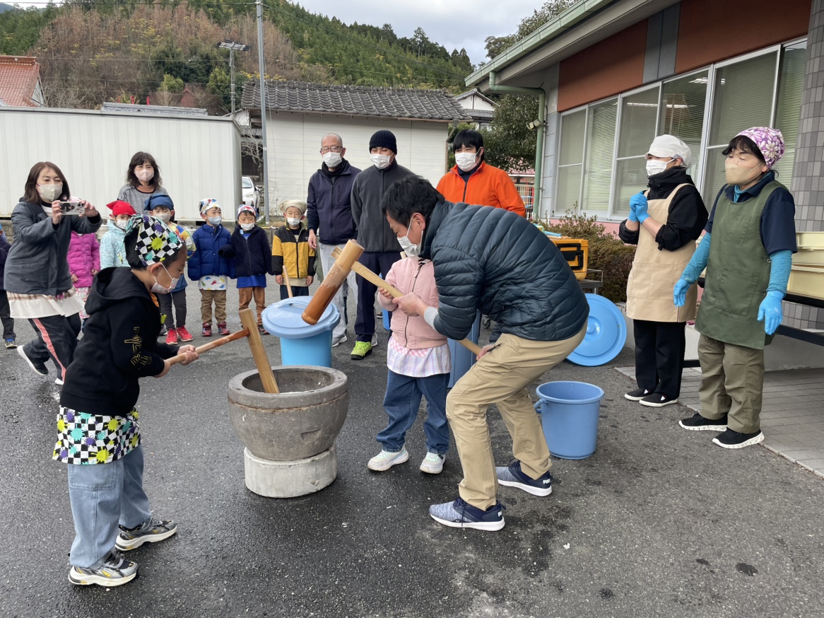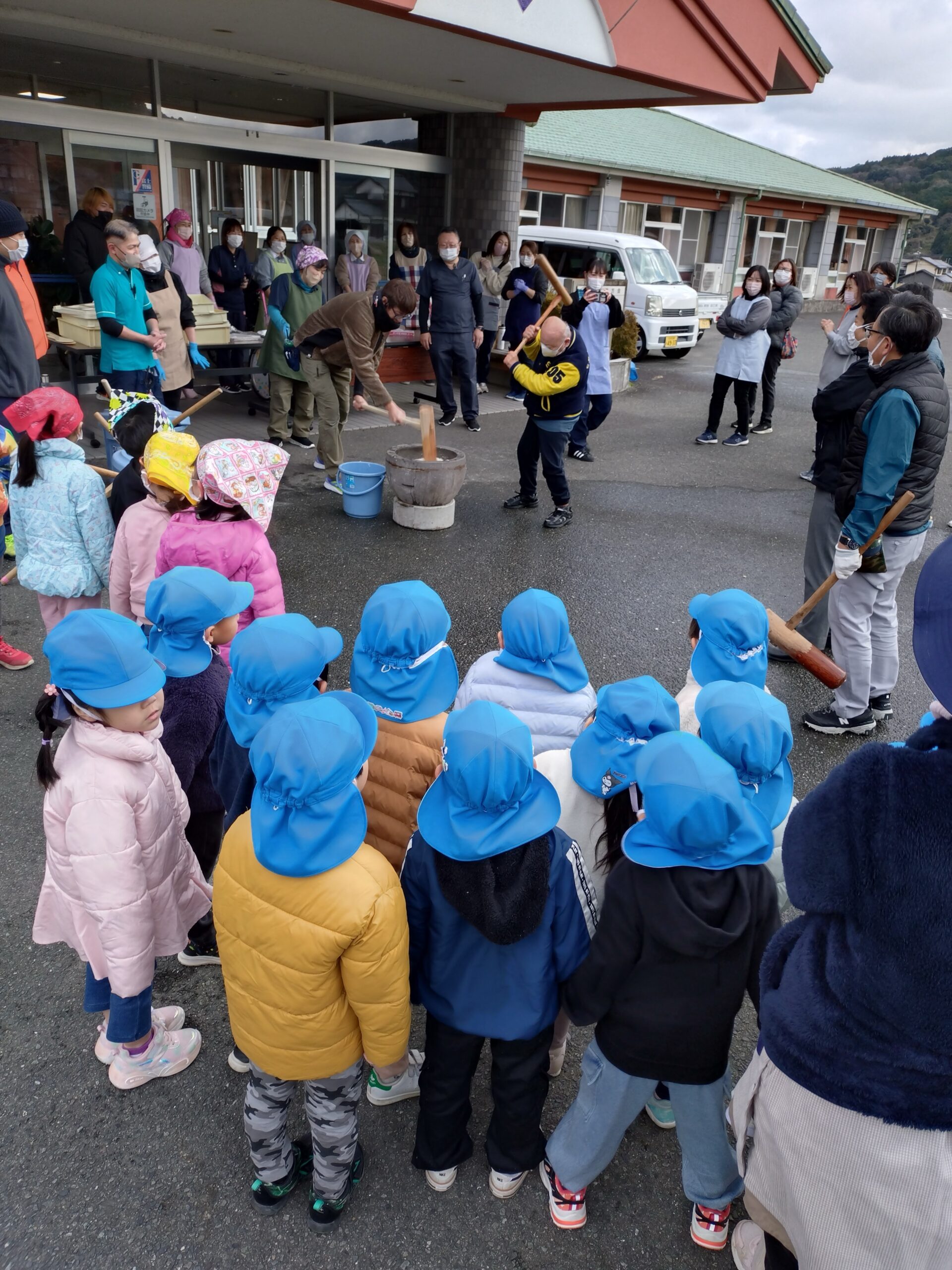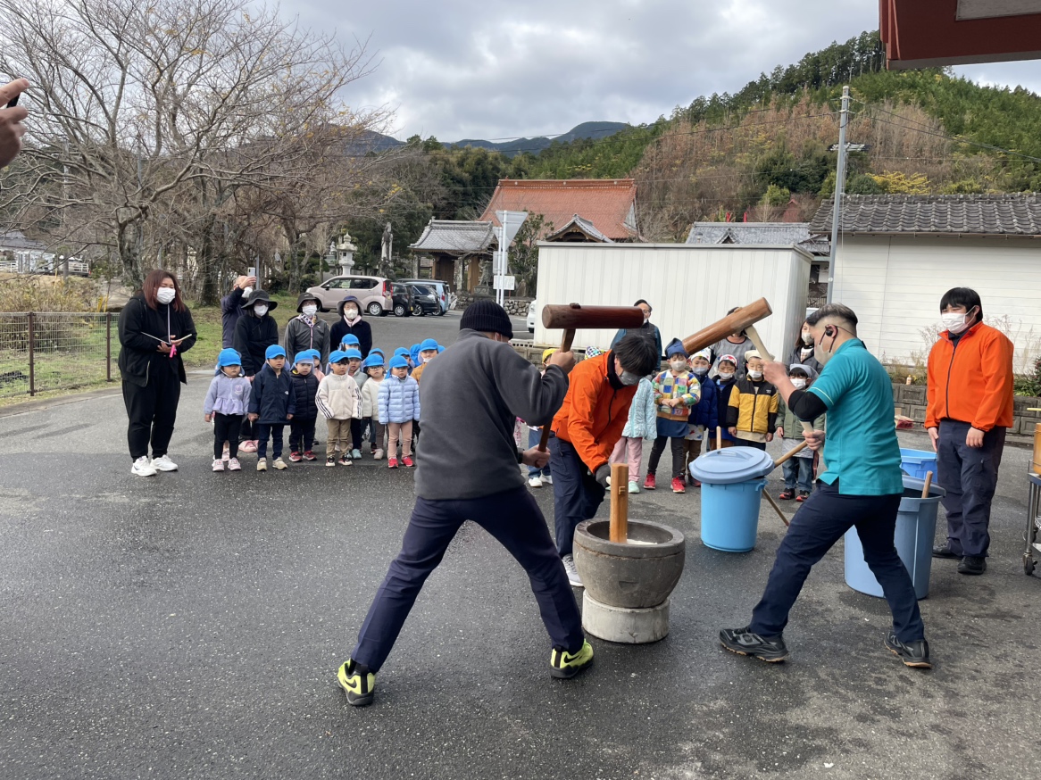 医王こども園の園児たちも餅つき会に参加し、可愛らしい掛け声でお餅をつかれました❣❣❣