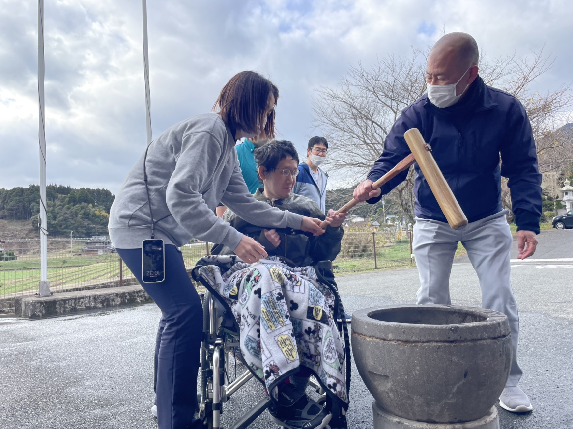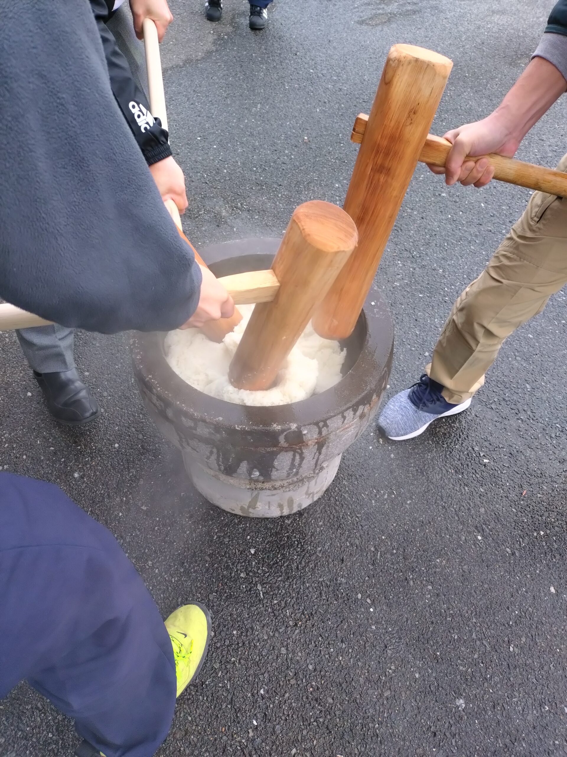 餅をつきながら「イチ・ニ・サン」の声や、「よっこいしょー、よっこいしょー」っと声を出しつきましたー(^^♡
