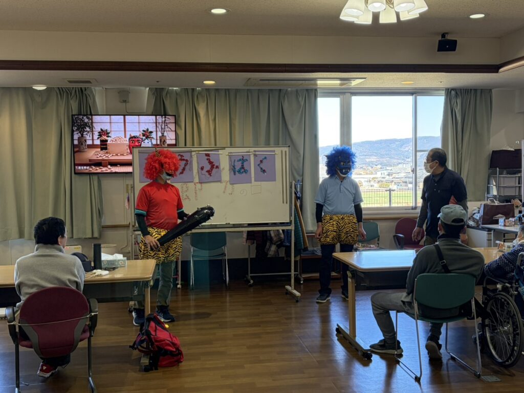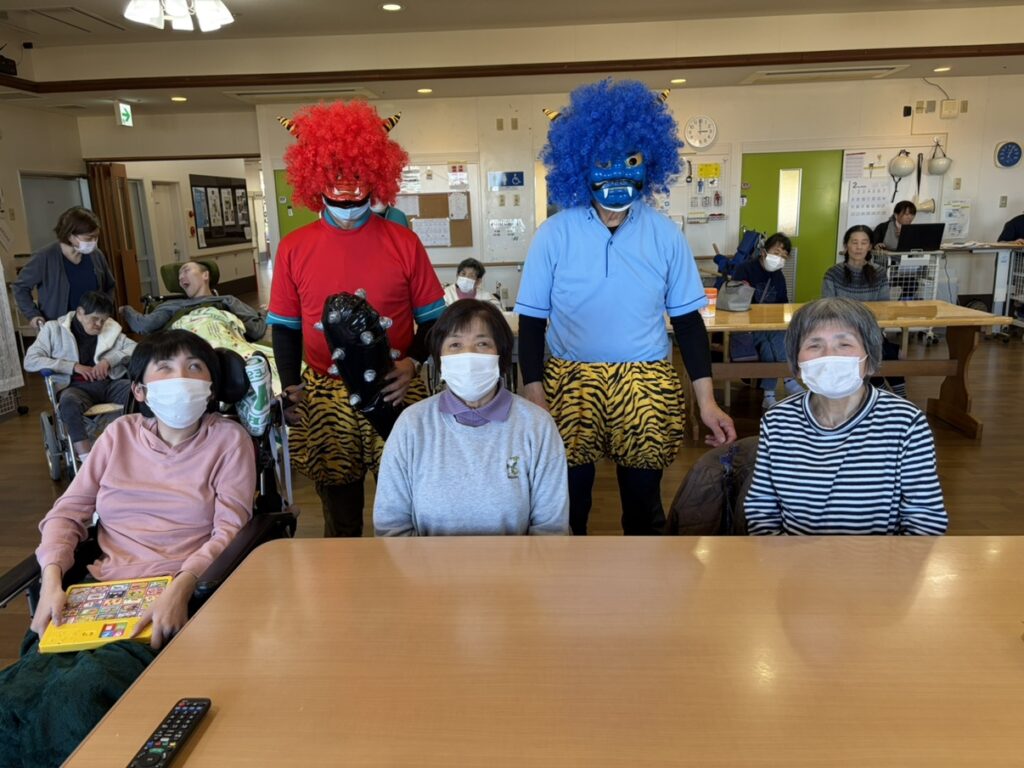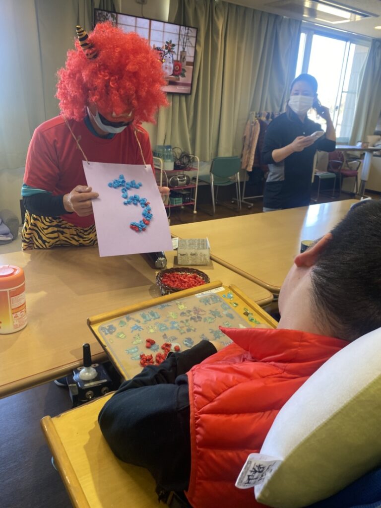 鬼に扮したスタッフが登場し「鬼は外」、「福は内」と元気な掛け声とともに、豆(紙で作りました。)を投げ見事に鬼を退治しました。最後はミニゲームと記念撮影を行いました。今年も一年皆さんが健康で楽しく過ごせますように。